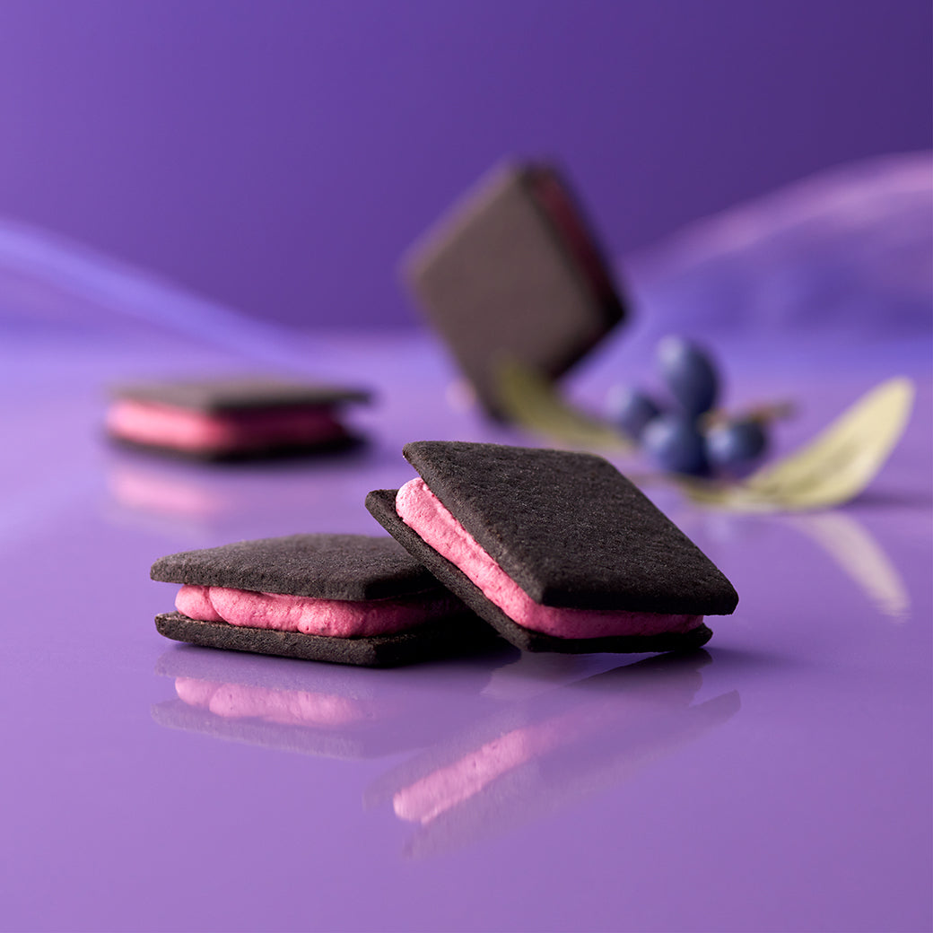 北海道の特産果実ハスカップのジャムとホワイトチョコを合わせた特製バタークリームを、香ばしいココアクッキーでサンドしました。