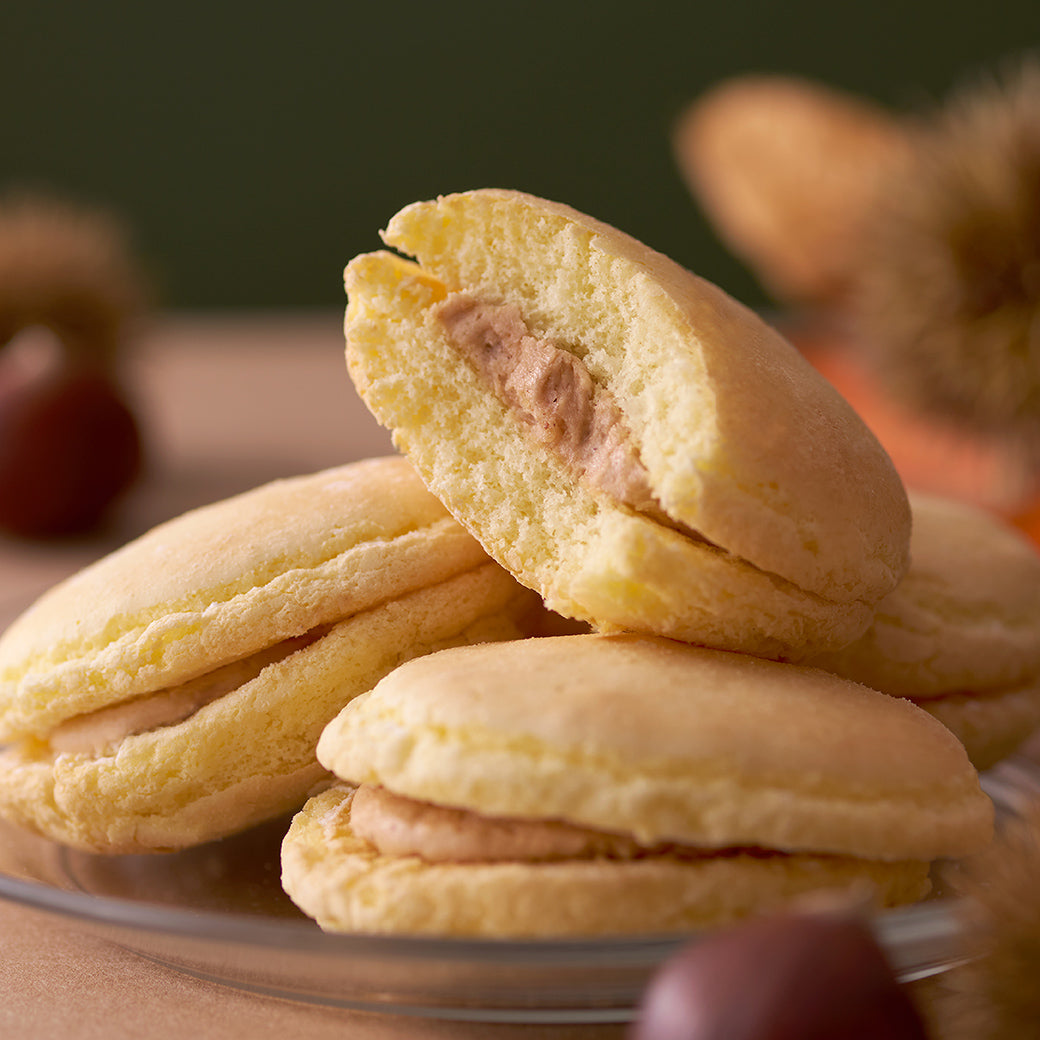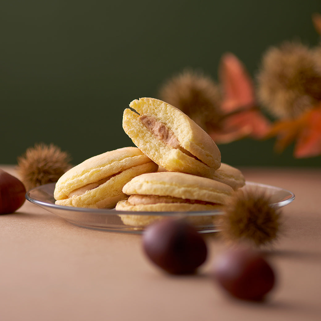 サクッと軽やかな口当たりのブッセに、マロンの香りと甘みが広がるバタークリームをサンド。