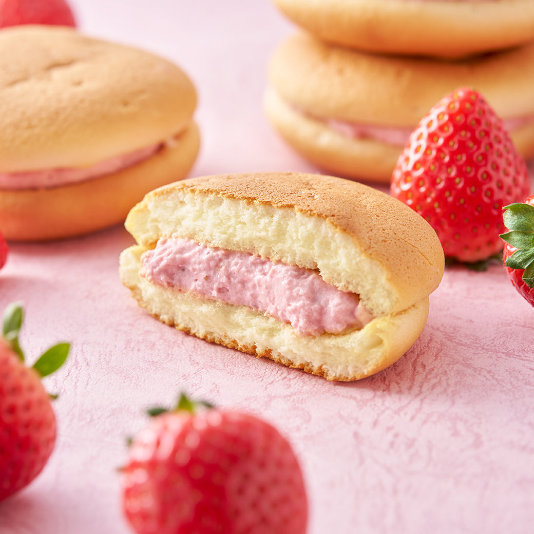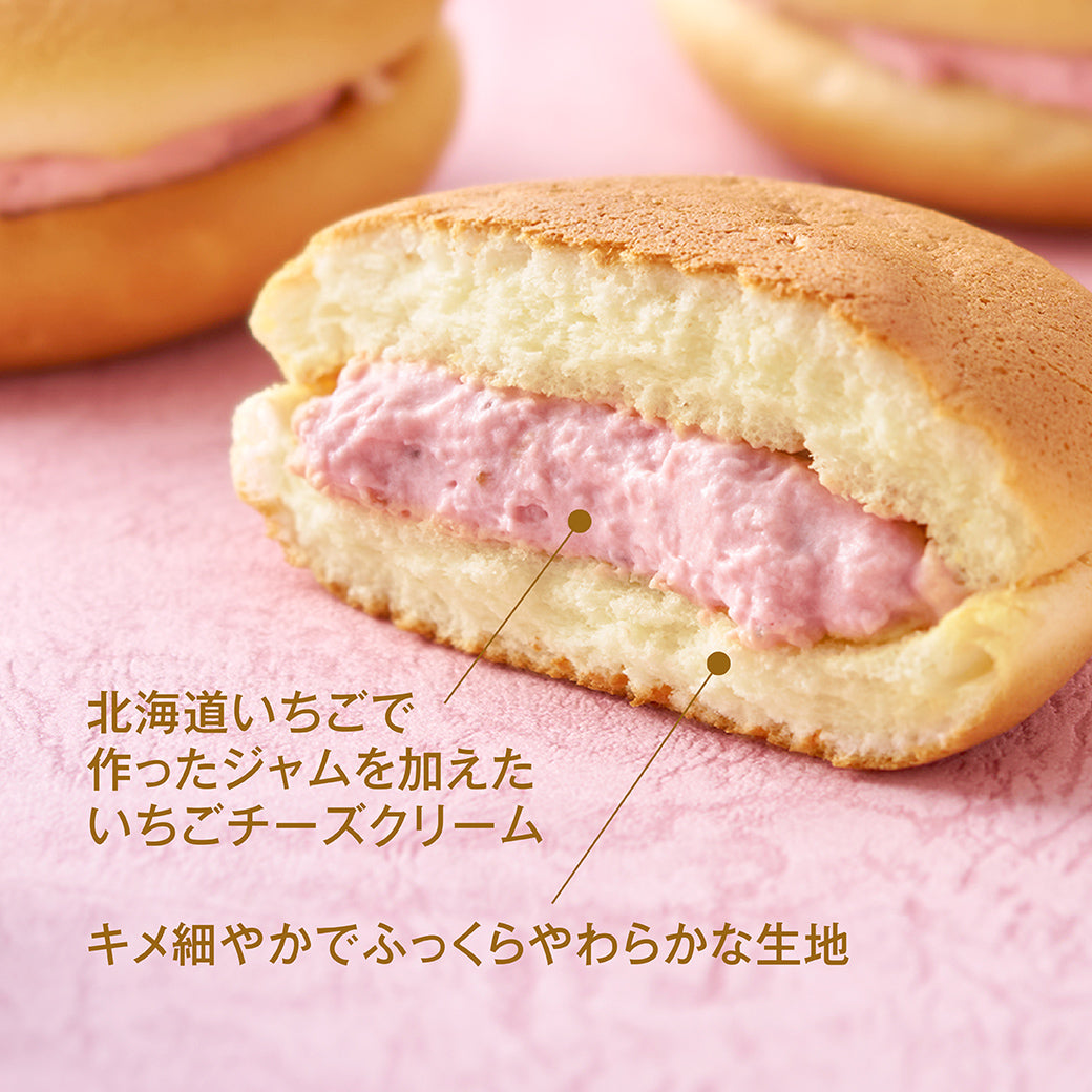 北海道いちごで作ったいちごジャムを加えた、爽やかな味わいのいちごチーズクリームをサンド。ふわふわでやわらかなスフレ生地は、いちごチーズクリームをしっかりと受け止めるため、絶妙なマリアージュをお楽しみいただけます。