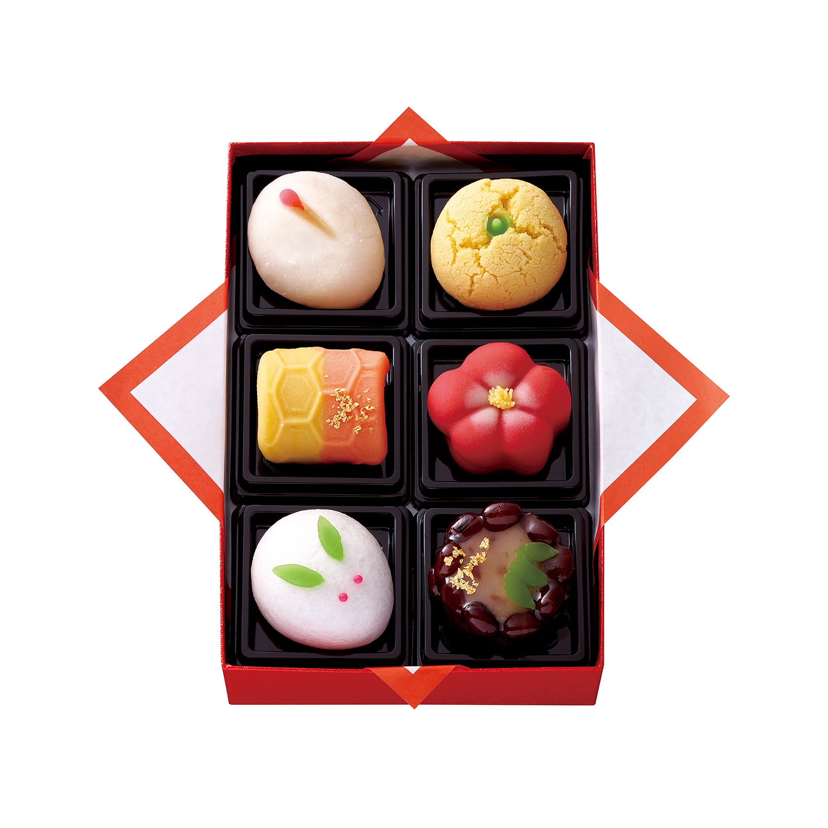 お正月の食卓をより華やかに。色とりどりの6種類の上和生菓子を詰め合わせました。 ほっとするやさしい甘みと和の色彩とともに、新年のゆったりとした時間をお楽しみください。